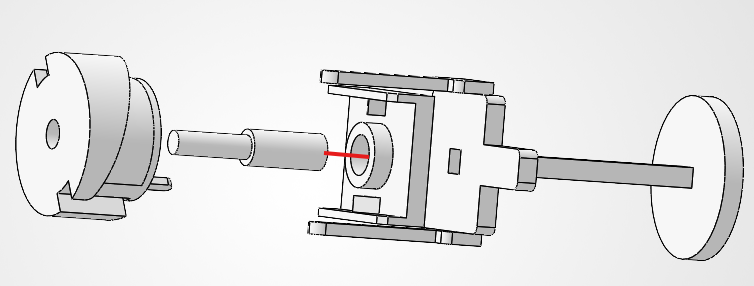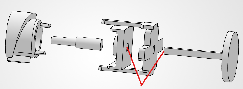 印刷した部品を組み立てます。下図の赤線で繋がっているところは接着剤で固定します。下図の3Dモデルにはばねが入っていませんが、最初にばねを入れ忘れないようにしましょう。接着剤で固定後はばねを入れることができなくなるためです。