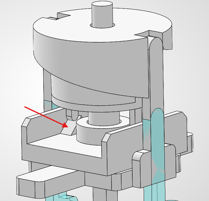 土台から出ている芯にばねを通すのですが、芯が細いとスライドベースを下げたときに折れるおそれがあったため、芯にはある程度の太さが必要です。スライドベースを下げたときに、スライドベースと芯が接触すると芯にはせん断方向の力がかかります。土台の3Dプリントの向き的に、芯はせん断方向の力に弱いため、芯はある程度太くする必要があります。太くしすぎても今度は対応するばねが無くなるため、バランスが大事です。