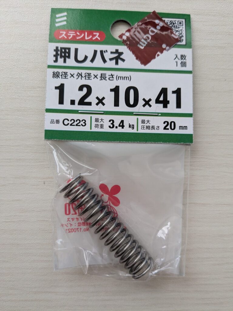 ホームセンターDCMで売っていたこちらのばねを使用します。ミスミで探したばねとは若干仕様が異なるので、使用するばねに合わせて3Dモデルを作成します。