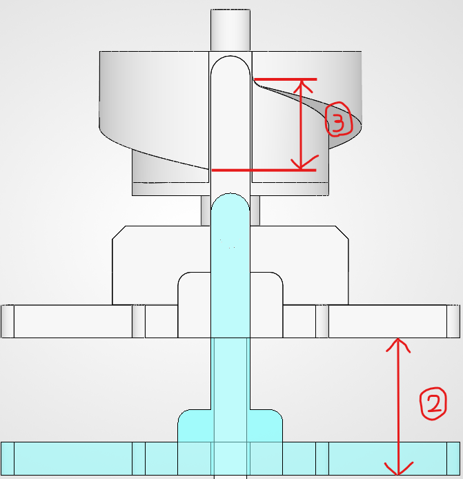本構造の肝となる回転パーツの傾斜部分ですが、スライドベースの下がり量②に対して、傾斜の高低差③は小さくなるようにします(② > ③)。この関係が成り立っていないと、スライドベースが元の位置に戻っても、柱の突き上げが傾斜の途中で終わってしまい、回転パーツが回転しきれなくなってしまいます。