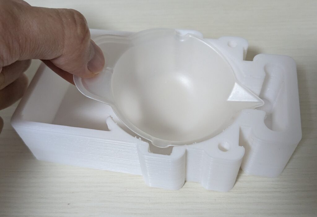 上記手順で本体と蓋を出力します。出力したものが下図で、調色パレットがちょうどケースに収まりました。蓋も位置決め用突起のおかげでピッタリ本体に嵌まりました。