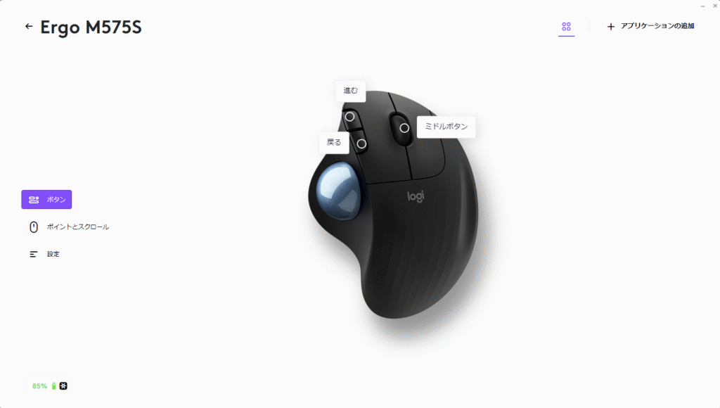 左右のメインボタンに加え、3つのボタン(ホイールクリック、進む、戻る)に自由に機能を割り当てられるのがM575Sの最大の魅力です。
