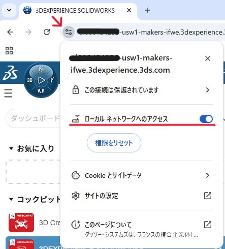 URLの左にあるボタンをクリックして、「ローカルネットワークへのアクセス」を有効にします。有効後に再度ページを読み込めばOKです。